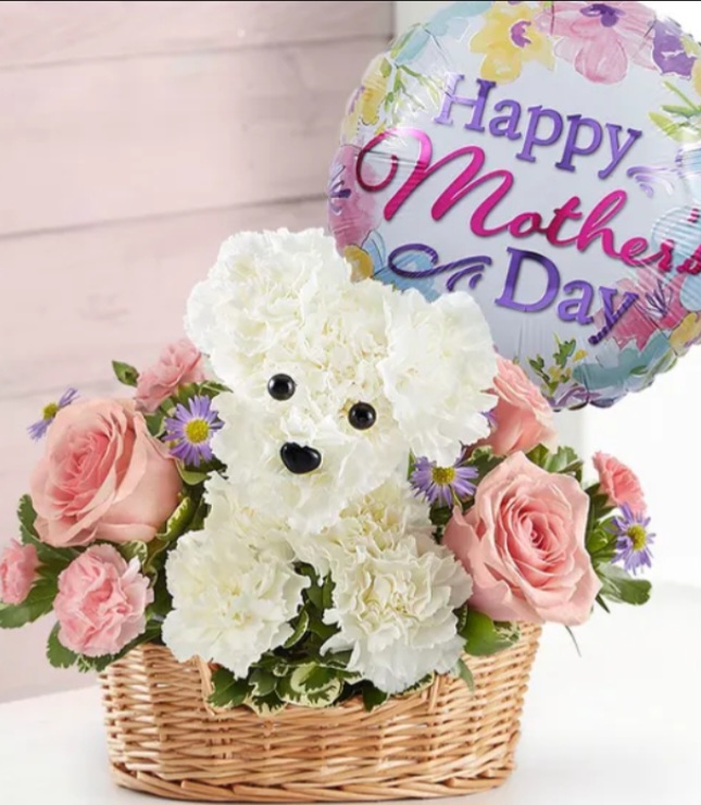 Nestled in a charming wicker basket, this playful and heartwarming floral arrangement is designed to resemble awhite puppy sitting cheerfully among a bed of blooms. The puppy’s fluffy “fur” is crafted from tightly clustered white carnations and white hydrangea, giving it a soft, cuddly appearance. ( Basket substitutions may apply)