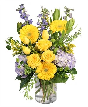 This is a spring inspired mixed floral arrangement described as a bright spring mixed bouquet with a strong yellow and purple palette. It blends classic blooms with textured accents to create something cheerful, full, and elegant. The design blends round, full blooms with tall, linear flowers to create a balanced, garden‑style composition in a clear glass vase.